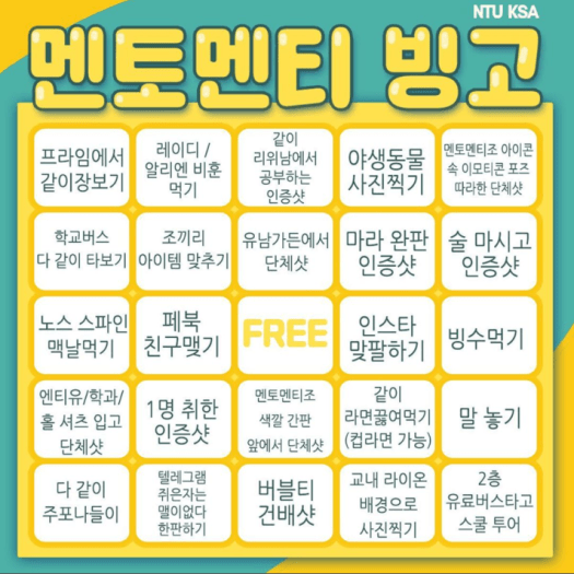 Posted on 10th 8월 202012th 2월 2025 by NTU KSA AY20/21 멘토멘티 빙고 ⭐️멘토멘티 빙고 미션⭐️ 🔍인증 방법: 인스타 스토리를 통해 @ntu_ksa 와 함께 추억을 만든 멘토멘티 그룹 멤버들을 태그해주세요!🔍마감일: 9월 30일🔍최대한 많은 빙고를 만드는 멘토멘티조에게는 ✨특별한✨상품이 주어질 예정이니! 적극적인 참여부탁드립니다. 관련