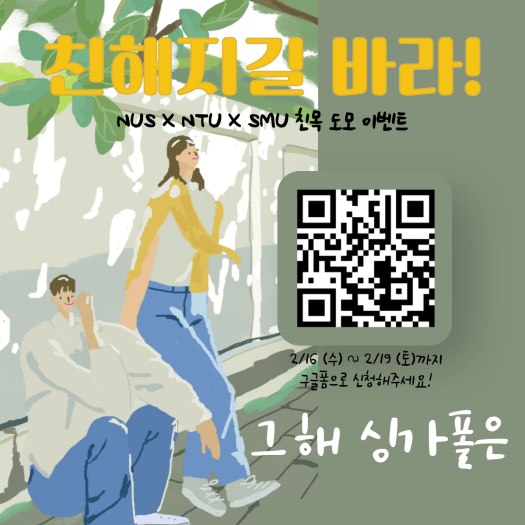 NTU, NUS, SMU 재학생들 총 5명이 한 조를 이루어 다양한 친목 활동을 하는 ‘친해바라’ 이벤트가 진행 예정입니다. 관심 있으신 분들은 구글폼을 작성하여 신청해 주시길 바랍니다.