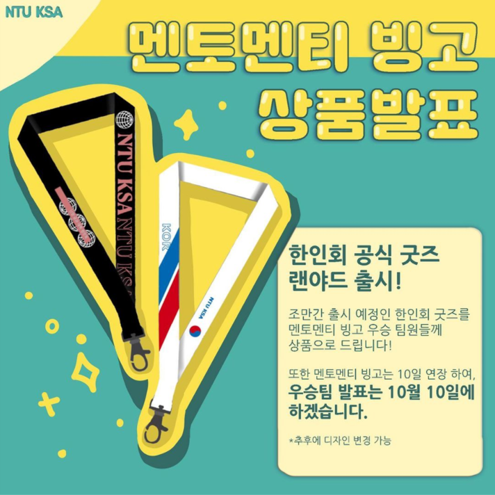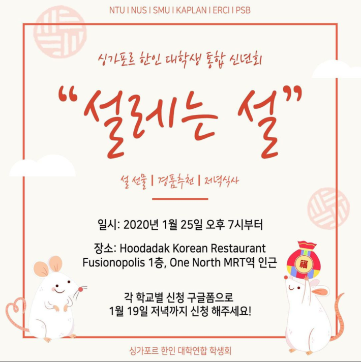 AY20-21 이벤트 NTU 한인학생회가 2020-2021에 진행했던 이벤트들입니다. 이연재 3기 회장 당선 – 210422 AY21-22 한인학생회장선거 – 210420 친해지길 바라 (NUS) – 210219 버블티 나눔 (gradsing) – 210211 AY21-22 임원진 선발 – 201214 AY20-21 웰페어팩 – 201120 한인회 랜야드 출시 – 200928 AY20-21 멘토멘티 – 200810 AY20-21 오티 – 200806 설레는 설 – 200116